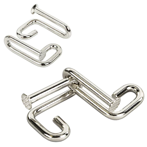 В набор входит шесть головоломок. Металлический пазл — это два элемента, изготовленных из нержавеющей стали диаметром 5,1 мм. Смысл решения этой логической задачи — разъединить детали, а потом собрать их обратно. Подсказку решения можно найти внутри упаковки.