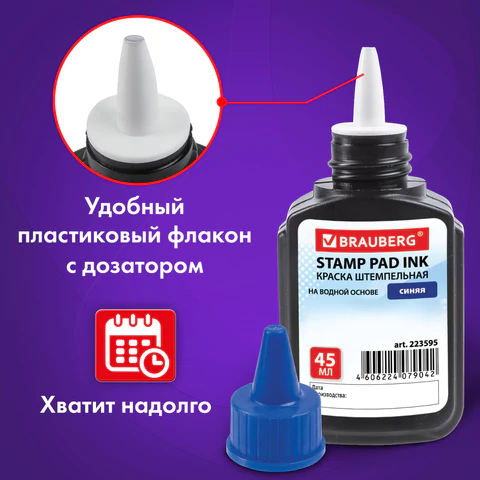 Оттиск, выполненный краской Brauberg, можно наносить на все виды бумаги, за исключением глянцевой. Цвет чернил — черный, основа — водная. Упаковка — пластиковый флакон с дозатором. Объем флакона — 45 мл. Время высыхания — 30 секунд.